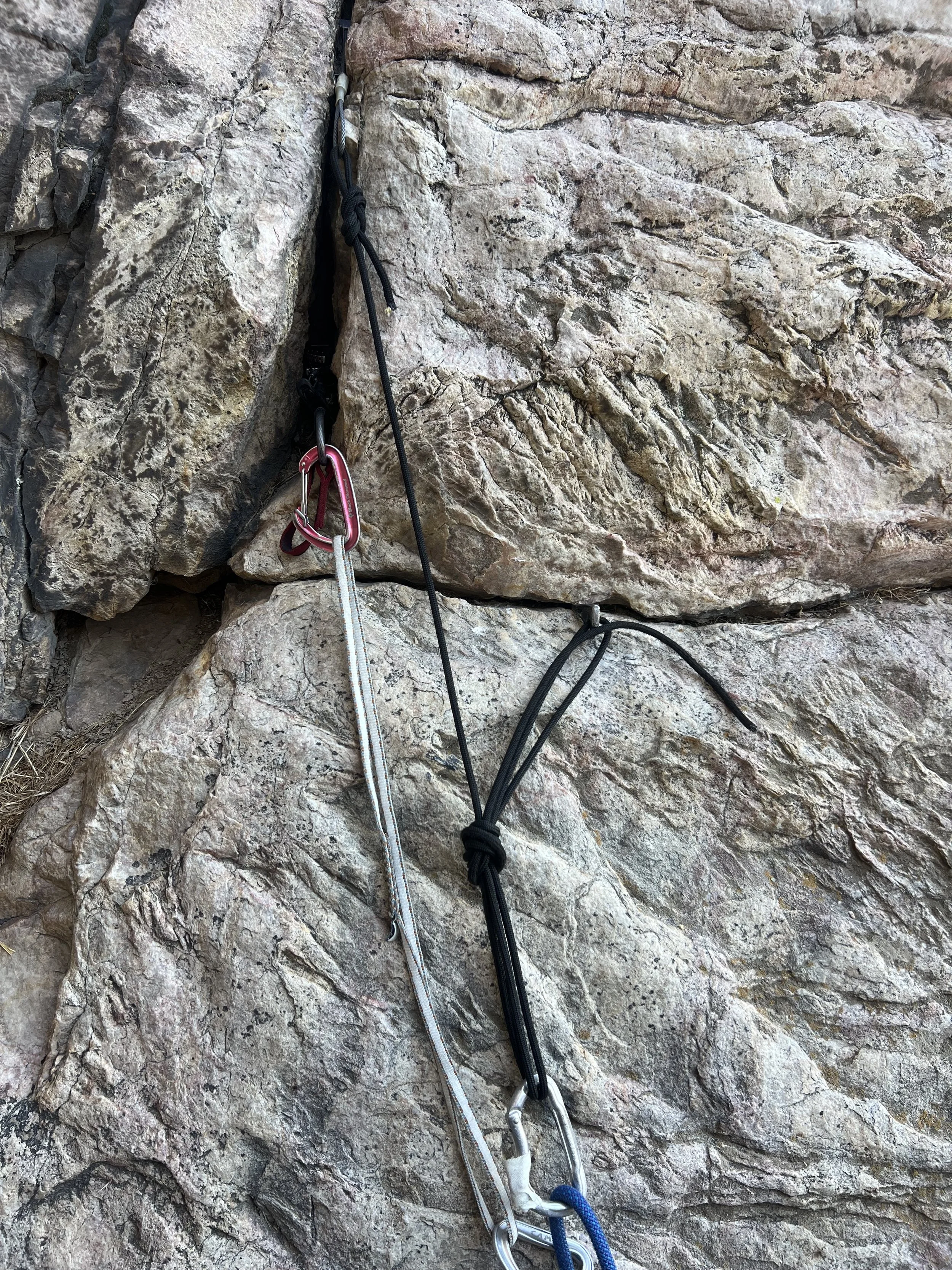 A rappel anchor around a rock thread in the Wind River Range of Wyoming. Can you spot the material that needed replacement?