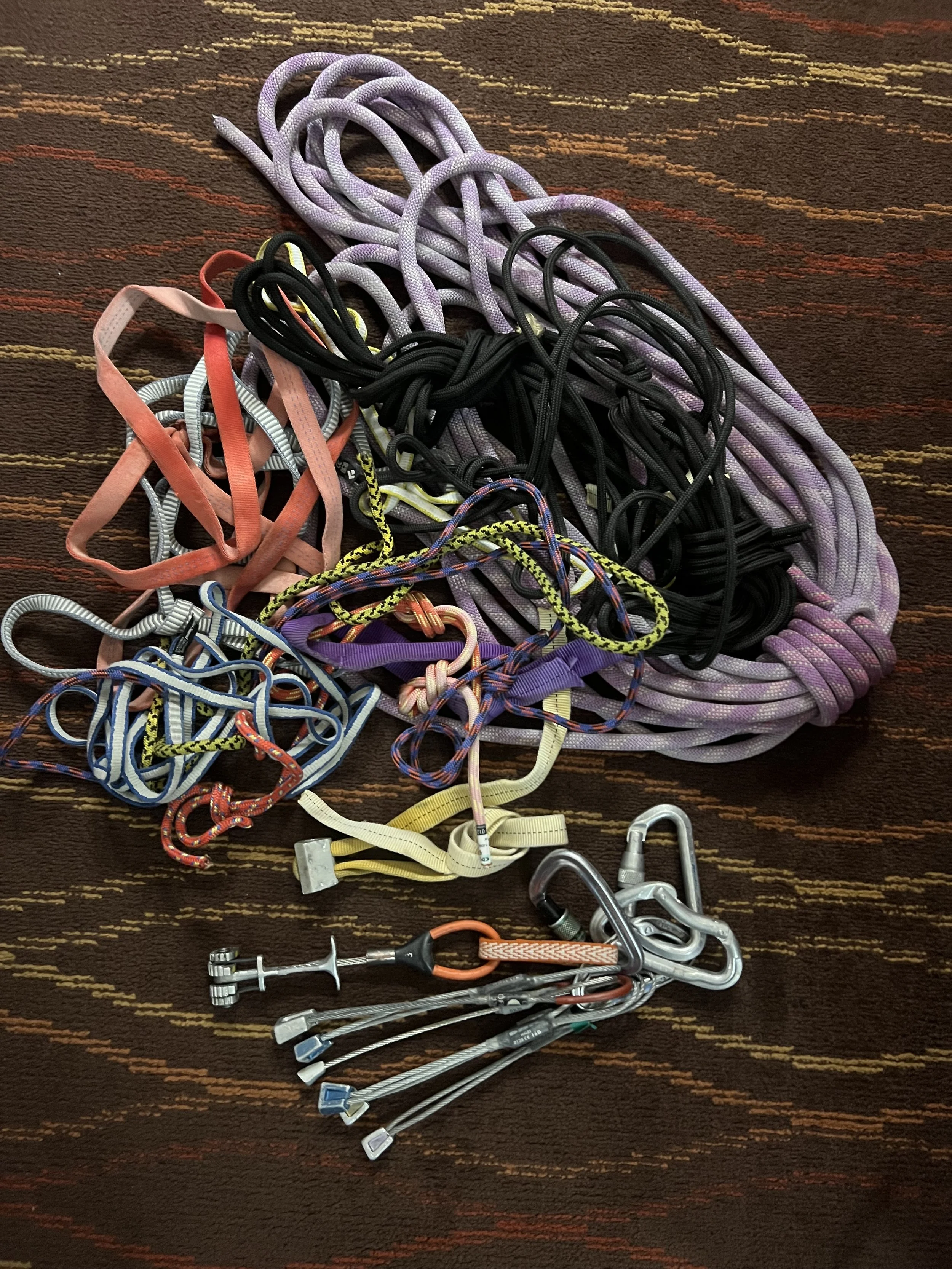 A few stoppers (nuts): Lightweight, inexpensive, and essential. These are perfect for reinforcing anchors, especially when you’re building from scratch or backing up sketchy placements. If one needs to be left behind, it’s a small price for a safer rappel.